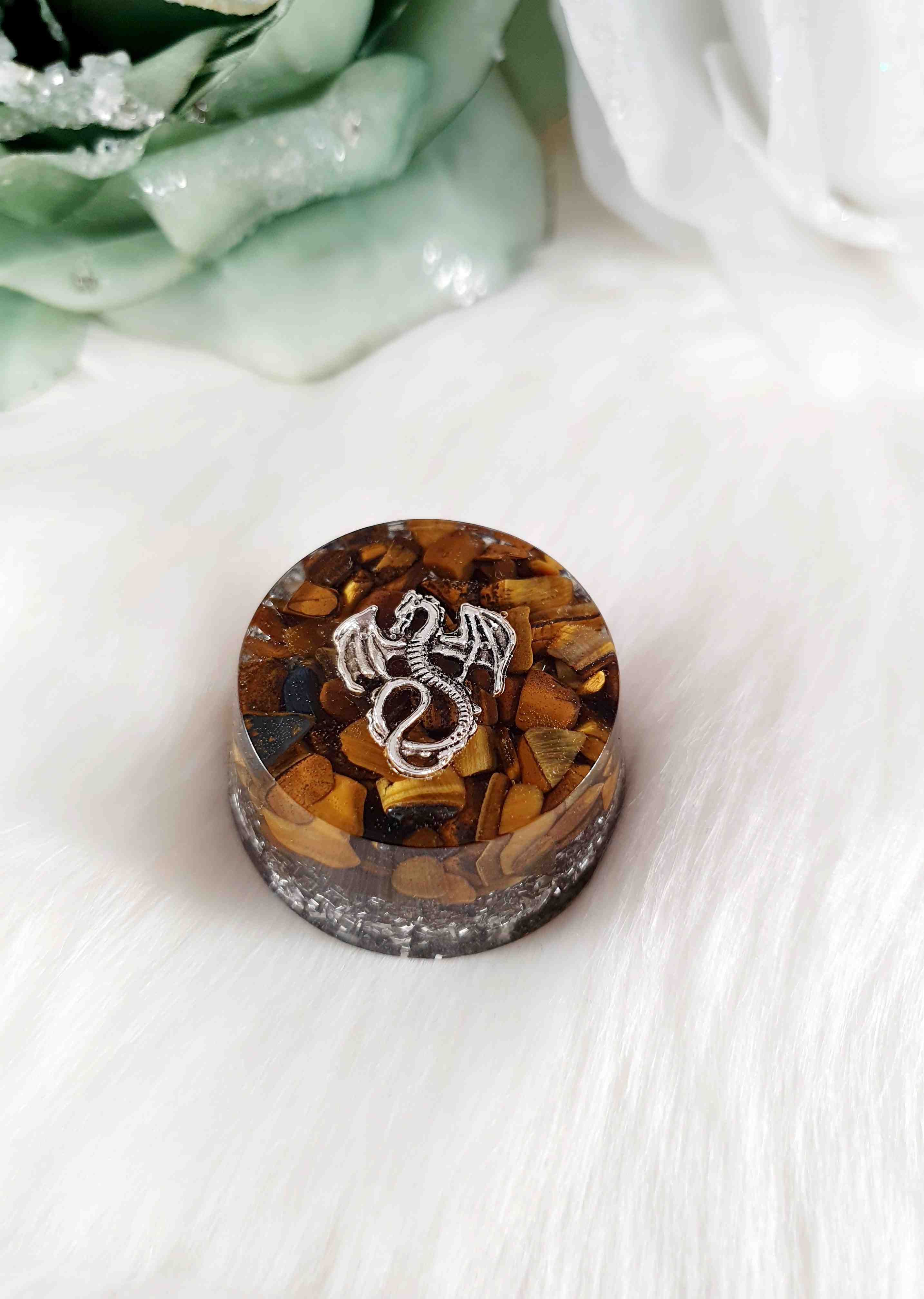 Bevat de volgende edelsteen Tijgeroog Omschrijving Zak orgonite Draak met Tijgeroog Ronde zakorgonites, uitlopend van 3,2 cm doorsnede naar 3,7 cm doorsnede.